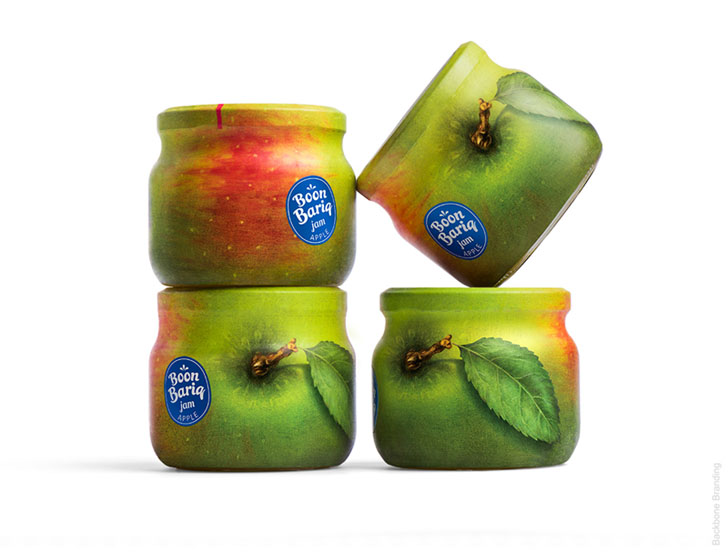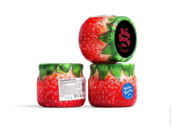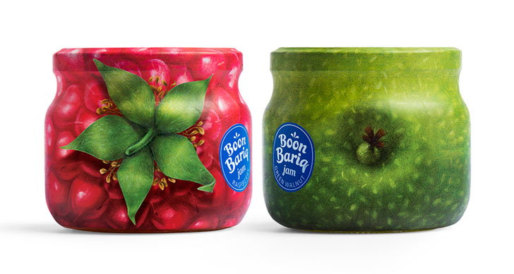 Boon Bariq考慮到果脯細分市場的激烈競爭,必須打造一款特別的產品來突破。他們開發了一種新的水果保鮮配方,并從特選的果園中采集了產品。為了使其產品與競爭對手區分開來,決定在他的食譜中使用更多的天然成分,其中水果和漿果的比例更高。同時,Boon Bariq也希望在品牌理念和產品的外包裝設計中表達這些優勢。設計師通過研究多種說明水果和標簽設計的方法,我們發現許多品牌使用四分之一或一半的罐子表面來說明水果并展示品牌信息。最后為了最好地傳達罐中水果和漿果的高比例,想出了一個簡單的解決方案:用果皮包裹整個罐子。