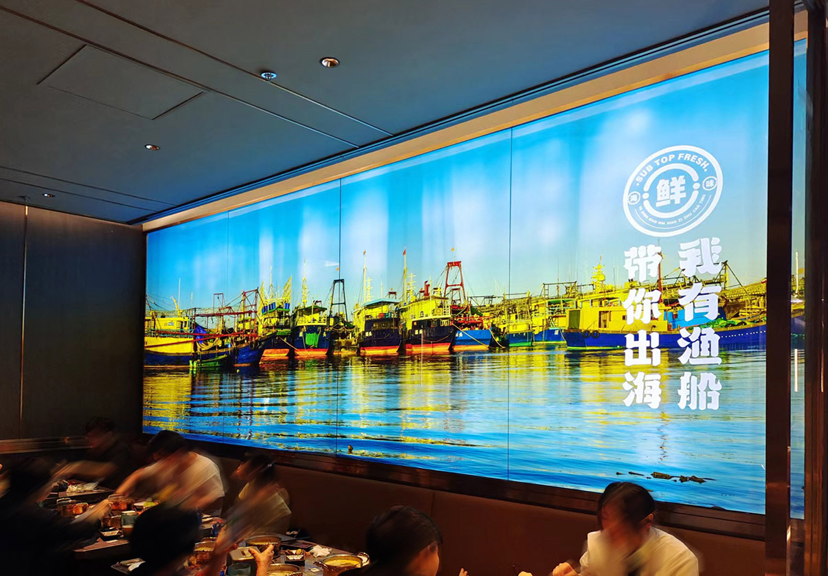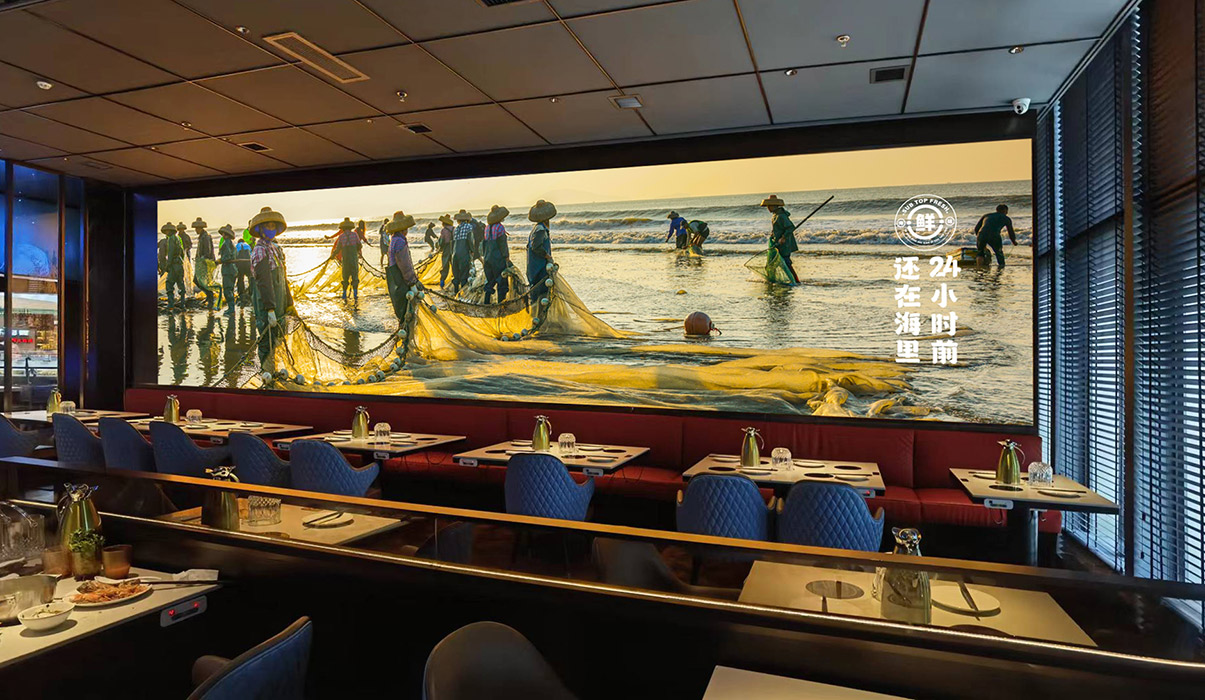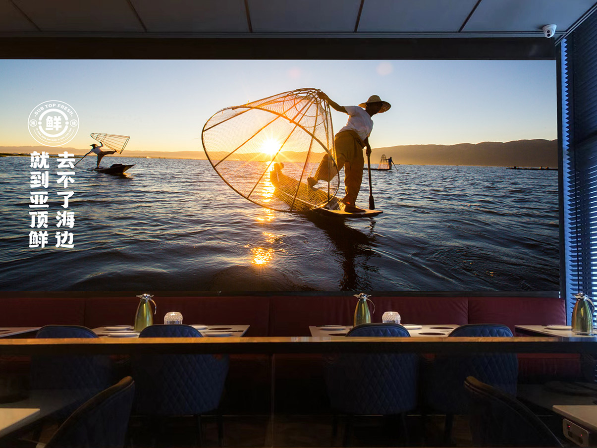 品牌主畫面描繪了晚霞中勤勞的漁民駕著漁船緩緩靠岸的場景,濃郁的海洋氣息撲面而來,讓人仿佛置身于海洋之中。搭配藍(lán)色深邃的海底世界懸吊燈箱和悠游的潔白水母,讓顧客在品嘗美食的同時,也能感受到餐廳獨特的品牌魅力。