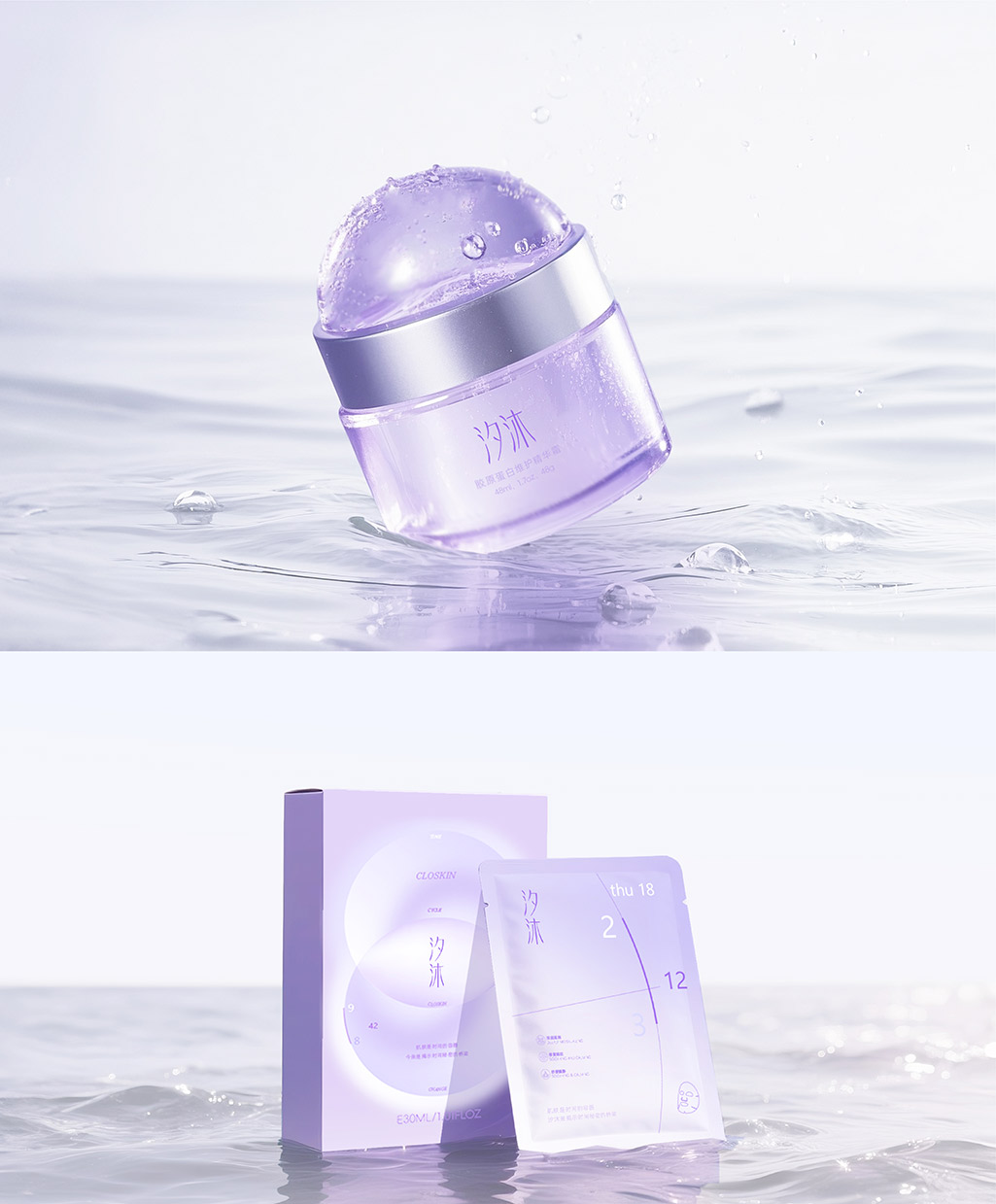 主色采用淡淡的芋色, 芋色(淡薰衣草紫)完美融合了藍(lán)色的寧靜(時(shí)間感、永恒感)與紅色的溫柔(肌膚感、生命力)。它朦朧、淡雅、治愈,仿佛晨曦初露或暮色將至?xí)r的天光,自帶一種超越時(shí)間的靜謐感和高級(jí)感,能瞬間與“護(hù)膚”的愉悅體驗(yàn)產(chǎn)生聯(lián)結(jié)。